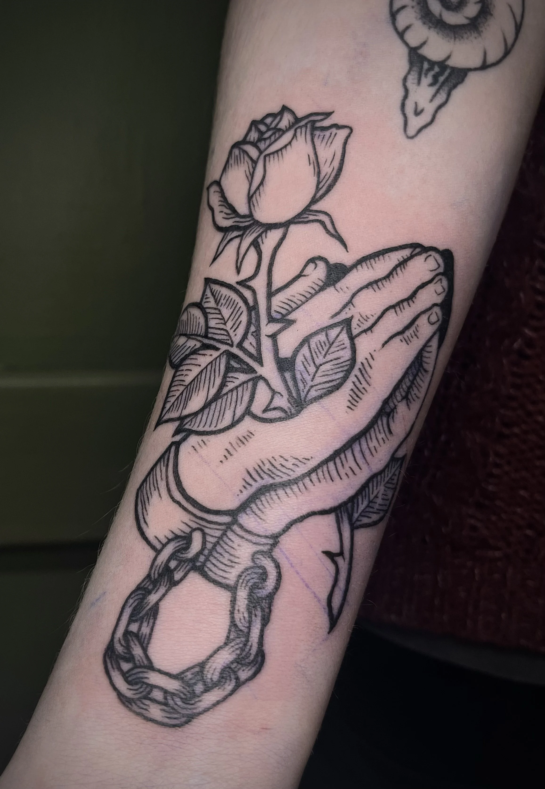 Josie is a queer artist and tattooer specializing in Woodcut and Black work styles. They also enjoy working in American traditional and their favorite subject matters are nature, the occult, myth, and medieval imagery. They take a trauma informed approach that prioritizes the comfort of their clients and offer quiet chair appointments, fidgets, earplugs, and other accommodations for those who need it. When they’re not working they enjoy being outside, making music, going to shows, bone collecting, and finding new hobbies to obsess over.